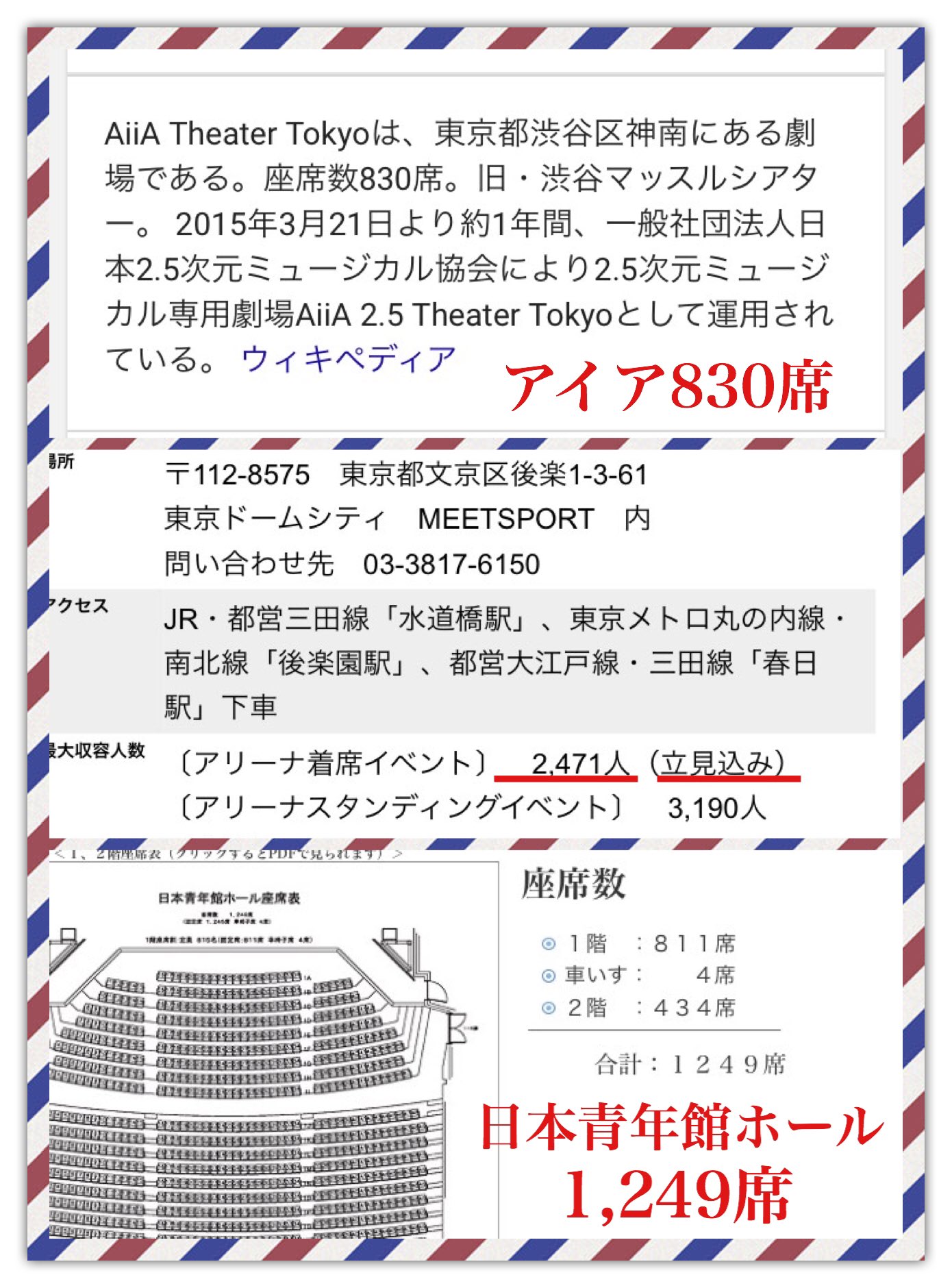 下睫毛 刀ミュ新作公演東京会場 座席数はこんな感じです アイア0席だったのに比べて 東京ドームシティホール2 471席 凱旋 日本青年館ホール 1 249席 かなり座席が増えました 倍率はんぱないと思うけど